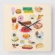 A vector art of different varieties of food such as cotton candy, hamburger, fried prawns, gyoza, pizza, potato fries, hotdog, donut, corndogs, jelly, ramen, lasagna, sundae, ice cream, muffin, nachos, mochi, sushi, sandwich, rice ball, and taco.