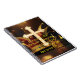 Large golden cross with jester hat and golden crown with typography design.