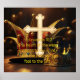 Large golden cross with jester hat and golden crown with typography design.