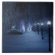 A snow-covered path meandering through the birch forest on a dark winter night. The way is lined with lampposts giving off a silvery blue glow, but in the shadows are bright, mesmerising shapes like little fairy lights, luring the traveller off the trail. In the distance the lavender glow of some mysterious forest gathering lights up the cold sky.