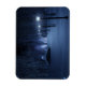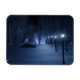 A snow-covered path meandering through the birch forest on a dark winter night. The way is lined with lampposts giving off a silvery blue glow, but in the shadows are bright, mesmerising shapes like little fairy lights, luring the traveller off the trail. In the distance the lavender glow of some mysterious forest gathering lights up the cold sky.