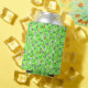 This football design shows the colours of the team you follow. Shirts are in green. image is an illustration of football shirts in green, happy football fan faces, and bouncing balls. Overall pattern in a cartoon style.