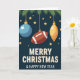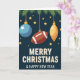 Get ready to score a touchdown with this festive football-themed Christmas greeting card! 🎅🏼🎄 The ornaments are vibrant and playful, with the football ornament taking center stage in all its red-brown and white glory. The backdrop of dark blue and gold stars sets the perfect holiday scene, while the green pine boughs add a touch of Christmas cheer. The bold white text at the bottom ensures your message of "MERRY CHRISTMAS & HAPPY NEW YEAR" shines bright. 🎁 This card is the perfect way to spread holiday joy to all the football fans in your life!