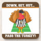 Thanksgiving and football are the design theme of these hard plastic drink coasters with cork back. Sold in sets of 6. Design features a turkey in a referee shirt on a football field with the words "Down, Set, Hut...Pass The Turkey" written on them.
