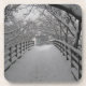 A snowy foot bridge leading to the Charles River