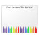 Designed for a teacher, this colourful and useful notepad can be personalised with any name. There is a row of brightly coloured wax crayons along the bottom, and at the top the words: From the desk of [your name]. The background is white for the easy reading of notes.