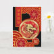 Chinese New Year, paper greeting card with a dragon in red and gold. A vertical banner with Chinese New Year greetings, concentric circles, and chrysanthemums are featured in the design. Art, image, and verse copyright © Shoaff Ballanger Studios, 2024.