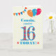 A colorful birthday card for a 16-year-old cousin, The large number 16 is filled with an orange, red and blue pattern, outlined in bright blue. There are balloons and bunting at the top, in matching colors and the front cover greeting is, 'Cousin, you're 16 today!' in bright red and blue lettering, on a very pale yellow and white polka dot background, with red and orange stars each side of the word 'TODAY!'. The inside message can easily be customized or deleted if you wish.