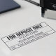 This high quality, ultra modern self inking deposit stamp is the perfect office supply for the small business owner, accountant and corporate professional who values both efficiency and a minimalist aesthetic. The design features a crisp, uniform sans serif font with impeccable alignment and deliberate white space, emphasizing visual hierarchy and simplicity. It is secure and compliant, featuring the required “FOR DEPOSIT ONLY” top line, your specific bank name and account number fields, ensuring smooth processing.