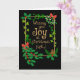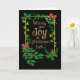 A stylish Christmas card for your father with traditional Christmas foliage, holly and mistletoe tied with red bows, ivy and fir sprigs and a fir cone, all on a black background. The front cover greeting in gold coloured decorative lettering is, 'Wishing you Joy at Christmas,' and 'Father' in an informal handwriting font. The inside message is just a suggestion and you can easily customise it to suit your needs or delete it altogether if you prefer a 'Blank Inside' card.