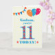 A colorful birthday card for an 11-year-old godson, The large number 11 filled with an orange, red and blue pattern, outlined in bright blue. There are balloons and bunting at the top, in matching colors and the front cover greeting is, 'Godson, you're 11 today!' in bright red and blue lettering, on a very pale yellow and white polka dot background, with red and orange stars each side of the word 'TODAY!'. The inside message can easily be customized or deleted if you wish.