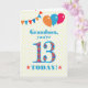 A colourful birthday card for an 13-year-old grandson, The large number 13 is filled with an orange, red and blue pattern, outlined in bright blue. There are balloons and bunting at the top, in matching colours and the front cover greeting is, 'Grandson, you're 13 today!' in bright red and blue lettering, on a very pale yellow and white polka dot background, with red and orange stars each side of the word 'TODAY!'. The inside message can easily be customised or deleted if you wish.