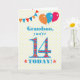 A colourful birthday card for a 14-year-old grandson, The large number 14 is filled with an orange, red and blue pattern, outlined in bright blue. There are balloons and bunting at the top, in matching colours and the front cover greeting is, 'Grandson, you're 14 today!' in bright red and blue lettering, on a very pale yellow and white polka dot background, with red and orange stars each side of the word 'TODAY!'. The inside message can easily be customised or deleted if you wish.