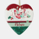 A gorgeous illustration of red shoes and perfume surrounded by cosmetics, a present, an ornament and a sprig of holly all sitting on a bed of pure white snow is the beautiful design on this elegant Christmas ornament for her. Painted in shades of red and green this stylish heart shaped ceramic ornament can be personalised on both front and back.