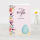 Designed with a soft watercolor look, this card centers on a romantic message where “FOR YOU” sits above and “WITH LOVE” sits below, while the word “wife” appears larger in deep berry lettering in the middle. Along the left edge, a flowing floral border spills downward with coral, fuchsia, and deep violet blossoms, tucked among teal and olive-green leaves and tiny ruby-red buds 🌷. The background fades from blush pink at the top into sandy beige at the bottom, like early morning light settling over a quiet scene. The gentle contrast between the smaller, simple lettering and the larger berry word gives the message a tender, devoted focus without crowding the artwork. Warm golden-yellow flowers peek through the bouquet, adding a friendly glow that feels like an affectionate glance shared between close partners. Near the bottom right, a robin’s egg blue oval ornament adds a festive touch, balancing the heavy florals on the opposite side 🐰. Its surface is traced with fine white vine-like swirls and curving patterns that stand out against the cool blue.
