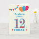 A colourful birthday card for an 12-year-old nephew, The large number 12 is filled with an orange, red and blue pattern, outlined in bright blue. There are balloons and bunting at the top, in matching colours and the front cover greeting is, 'Nephew, you're 12 today!' in bright red and blue lettering, on a very pale yellow and white polka dot background, with red and orange stars each side of the word 'TODAY!'. The inside message can easily be customised or deleted if you wish.