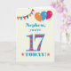 A colorful birthday card for a 17-year-old nephew, The large number 17 is filled with an orange, red and blue pattern, outlined in bright blue. There are balloons and bunting at the top, in matching colors and the front cover greeting is, 'Nephew, you're 17 today!' in bright red and blue lettering, on a very pale yellow and white polka dot background, with red and orange stars each side of the word 'TODAY!'. The inside message can easily be customized or deleted if you wish.