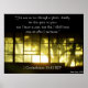 I took this picture in a horse barn at the Minnesota State Fair, of all places. It was near the end of the day and the sun was low in the west. The light poring through the many opaque panes was a bright glow at first, but on closer inspection it was a patchwork of yellow hues against the black, varying in shade and intensity where the shadows of trees outside fell across it. I chose the Corinthians quote-1 Corinthians 13:12-- for the poetry of the phrase, "For now we see through a glass, darkly." We may only see in part now, but that doesn't make the view any less beautiful.