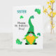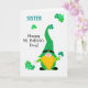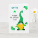 A fun greeting card for your sister on St. Patrick's Day, with a cute leprechaun, holding a shamrock. The leprechaun has a very tall hat, in a green pattern, a big ginger beard, a huge nose, striped sleeves and socks and black shoes. At the top, in dark green lettering, is the word, 'SISTER' and the inside message is easy to customise or delete.