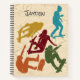 Add a name or other text to create your own personalised skateboarding themed notebook. The front cover features five silhouette style illustrations of skateboarders in mustard yellow, turquoise blue, dark red, rust orange and green set against a faux woodgrain background. Your custom text is in grey hand-written style lettering. The back cover has a coordinating woodgrain pattern.