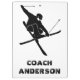 Create a personalised gift for ski coaches and skiers. This clipboard is ready to be personalised with a name in bold black lettering and features illustrations of skiers performing ski tricks the black graphics are depicted in a silhouette style with one on the back and one on the front of this clipboard.
