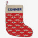Create a personalised Christmas stocking that's perfect for your favourite snowmobiler with this vintage themed design. This holiday stocking features a pattern of snowmobiles, snowy mountains and fluffy clouds in shades of blue and ivory or cream set against a red background. Personalise this stocking in blue letters at the top against a cream or ivory coloured background.