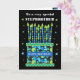 A bright birthday card for your stepbrother, with lots of patterned candles on a birthday cake. At the top of the front cover, the words, 'To a very special STEP BROTHER' are in a white lettering on the black background. There is a blue band around the cake with 'HAPPY BIRTHDAY!' also in white. Tiny blue, green and white stars are scattered around the black background and the inside verse is just a suggestion, which you can easily change or delete if you wish.