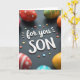 This card features the words “for you SON” in raised white letters centered on a deep charcoal-gray background, with the message feeling like a close, affectionate note meant for someone special 🐇. The lettering is crisp and three-dimensional, drawing your eye straight to the middle while the surrounding decorations sit slightly out of focus. Around the text are several egg-shaped decorations in rich red, green, yellow, and orange, arranged like a thoughtful ring that frames the dedication. Some eggs carry polka dots while others have stripes, and their softened edges give the scene a gentle, tender look, like a quiet celebration shared between family or close friends 🌷. Small round confetti pieces are scattered across the dark surface in matching colors, filling the space with light, festive detail without crowding the message. The lighting is subtle and directional, bringing out the texture of the raised letters and the matte background while leaving the outer decorations softly blurred. The white text sits squarely in the center, with the colorful eggs and tiny dots spread around it in a loose, balanced flat-lay arrangement.