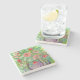 The coasters are gorgeous, a quality feel and heavy weight. They look like a precious archeological find. A rustic stone juxtaposed with a modern floral black and white print. I like the way the print goes slightly imperfect on the cut stone edges giving them a kind-of natural beauty.