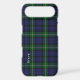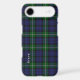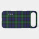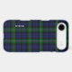 Handsome iPhone 7 case done in the green, blue, black, and white clan Forbes tartan plaid. Personalise the light grey text, running down the left side, for yourself or as a great gift idea. Stylish way to protect your electronic device.