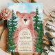 Cute baby boy design featuring a brown bear with a green spruce forest and watercolor blue sky. Easy to personalise with your information. Visit our shop to view our entire forest adventure bear collection.