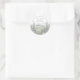 Wrapped along the top edge, the bride’s name and event date follow the curve of the sticker for a clean and balanced layout. At the bottom, a soft watercolor scene of pine trees, a winding path, and distant mountains adds a serene, nature-inspired touch.