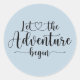 Let the adventure begin themed watercolor baby shower envelope and gift stickers, with calligraphy script typography, and little heart in the typography.