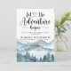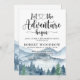 Let the adventure begin themed watercolor retirement party invitation with forest and mountains wilderness landscape with calligraphy script typography. A rustic forest adventure theme.