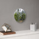 This clock design features a photo of a forest scene with coniferous trees, along with a mountain in the background. It also features rectangles marking the hours.