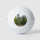 This golf ball design features a photo of a forest scene with coniferous trees, along with a mountain in the background.