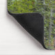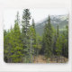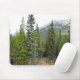 This mouse pad design features a photo of a forest scene with coniferous trees, along with a mountain in the background.
