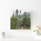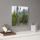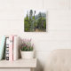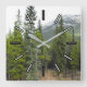 This square clock design features a photo of a forest scene with coniferous trees, along with a mountain in the background. It also features rectangles marking the hours.