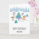 Birthday greeting card with a whimsical forest scene. Happy forest animals dancing around a green fir tree with presents underneath. Happy and joyful watercolor design.