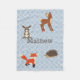 Sweet blue baby fleece blanket, with a white quadrefoil pattern and adorable graphics of a fawn, fox, hedgehog, and bunny. Personalise the brown text. Lovely baby gift idea.