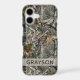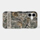 Customise this forest branches camouflage iPhone 17 case with your name in a trendy modern CAP font in grey on opaque cream. It's masculine and perfect for your favourite military, hunting, country or outdoorsman!