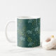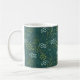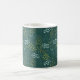 A stylized floral design on dark, spruce green combines white flowers, olive drab ferns, yellow-green grass, and blue-green leafy twigs, creating a beautiful coffee mug that you will love to use. Lovely boho style.