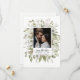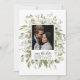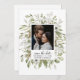 This delicate watercolor bouquet has soft foliage colours, olive green and sage green on bright white. The bride and grooms favourite engagement photo are featured in the centre of the bouquet with the wedding details directly below. The back side is blank. All text can be edited to suit the needs of your event. Coordinates with the Forest Foliage Winter Wedding Collection.