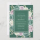 A deep forest green background provides a moody base for this design, which is surrounded by a lush collection of painterly roses. The palette includes soft lavender, dusty teal, and cream blossoms accented by delicate sage green foliage. This aesthetic offers a sophisticated and romantic feel for a winter or autumnal event. Each botanical element displays a soft, watercolor texture.