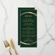 This wedding menu features a faux gold circle frame and simple calligraphy with a forest green background.