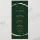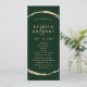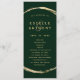 This wedding program features a faux gold circle frame with an elegant ampersand and simple calligraphy with a forest green background.