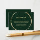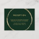This wedding reception enclosure card features a faux gold circle frame and simple calligraphy with a forest green background.