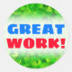 This sticker design features an abstract pattern of many triangle shapes coloured various shades of green. It could perhaps be said to resemble a dense forest of coniferous trees. It also features the motivational saying "GREAT WORK!" in blue and red coloured text. Stickers like these could perhaps be used by a teacher, an educator or a tutor to acknowledge encourage a student who has done well on a test, quiz, paper, project, or some other academic assignment. [~Z0000117]