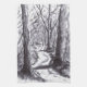fun gifts with an original black & white ink line & wash landscape drawing of a man walking over a little curving woodland path trough a dense forest in late autumn or early winter. with big moss covered trees on both sides. great gifts & presents with nature inspired traditional artwork by Frank Glerum & sold exclusively on Natural Arts.