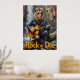 This dynamic artwork portrays a lion, looking effortlessly cool in sunglasses and a leather jacket, masterfully strumming an acoustic guitar. He's seated on a log beside a textured waterfall that feeds into a blue stream, surrounded by a rugged forest. The thick, expressive impasto creates a tangible texture, making the "Rock or Die" declaration resonate with the raw energy of the performance.